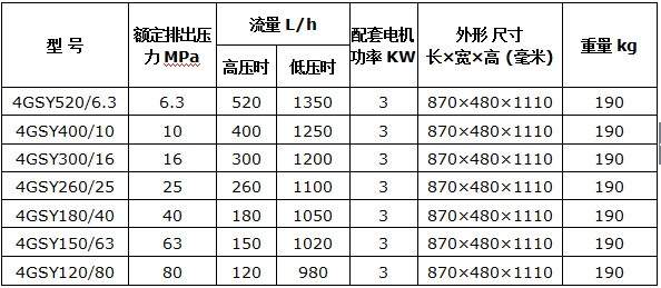 上??柋脴I(yè)生產的4GSY型四缸大流量系列電動試壓泵主要型號參數如下: