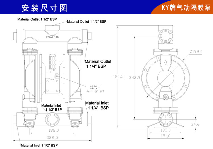 8.KY牌不銹鋼氣動(dòng)隔膜泵吸力好,壓力足,在高壓力工況下仍可以保證較大流量,適用于作為板框、廂式壓濾機(jī)的進(jìn)料泵。