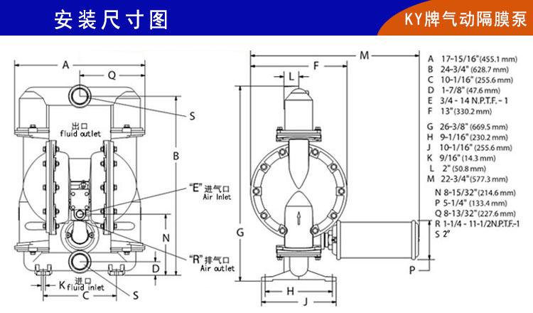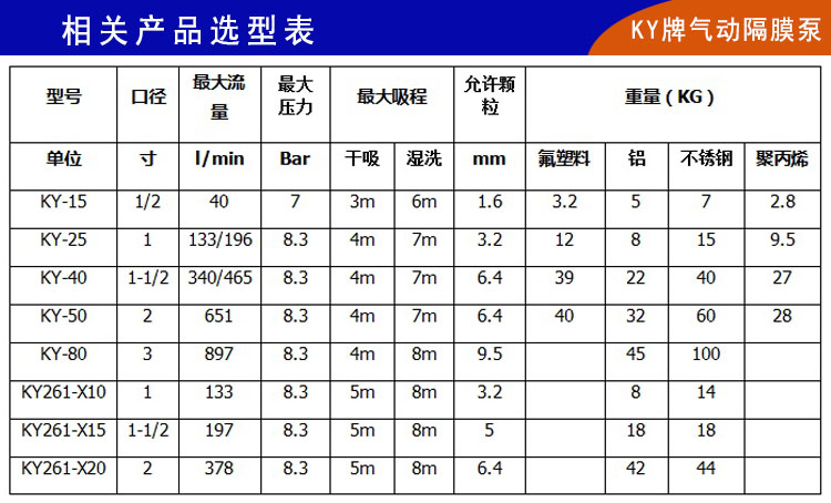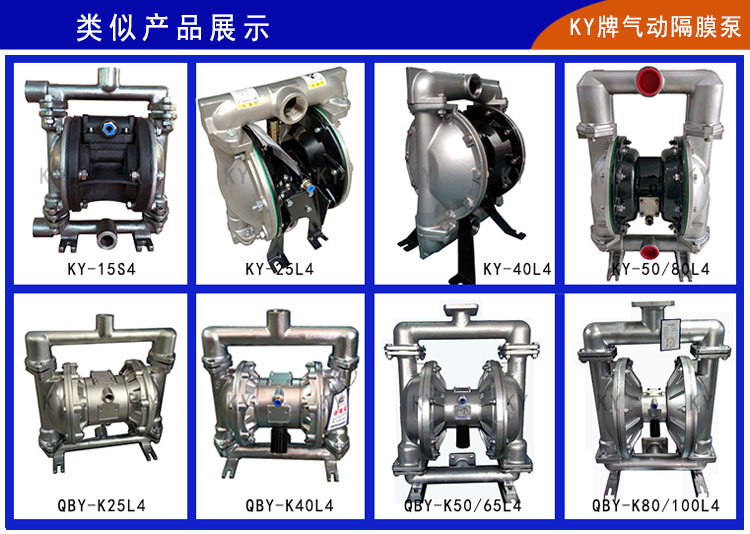 KY-50LP新一代氣動隔膜泵,配氣裝置進(jìn)一步革新,中間體和隔排為一體式;助動軸和助動滑塊也改為一體式生產(chǎn),并且增加了滑閥助動換氣裝置,大大提高了空氣利用效率,避免了因氣壓不穩(wěn)定而產(chǎn)生的死機(jī)、停機(jī);真正做到了無死機(jī),其脈沖也明顯降低,和自動化機(jī)械設(shè)備做到無縫連接。新型不銹鋼氣動隔膜泵整體構(gòu)造上更加優(yōu)化,泵腔和主管路都有明顯加強(qiáng),自吸功能和流量揚(yáng)程都有很大改善(最大流量/54立方/小時(shí),最大揚(yáng)程80米);被客戶成為超大流量304氣動隔膜泵和壓濾機(jī)專用304氣動隔膜泵。