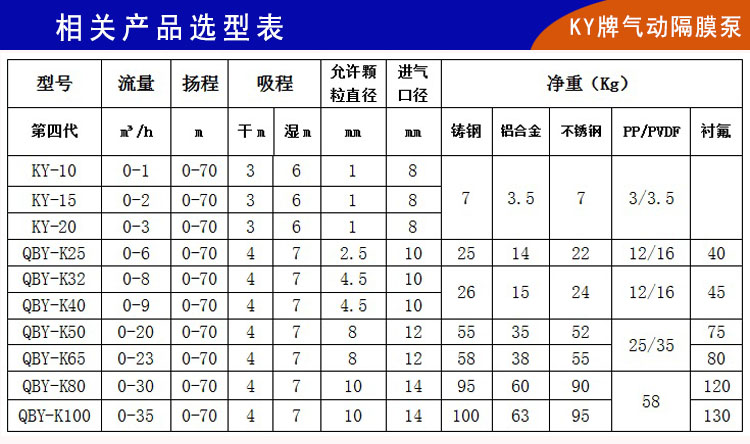上海楷陽(yáng)為方便客戶使用,第四代QBK系列氣動(dòng)隔膜泵已經(jīng)研發(fā)了十余種材質(zhì)生產(chǎn):鑄鐵氣動(dòng)隔膜泵、鋁合金氣動(dòng)隔膜泵、不銹鋼304氣動(dòng)隔膜泵、不銹鋼316L氣動(dòng)隔膜泵、工程塑料(增強(qiáng)聚丙烯)氣動(dòng)隔膜泵、氟塑料(PVDF)氣動(dòng)隔膜泵和耐腐蝕抗壓性能超強(qiáng)的鋼襯氟氣動(dòng)隔膜泵等。