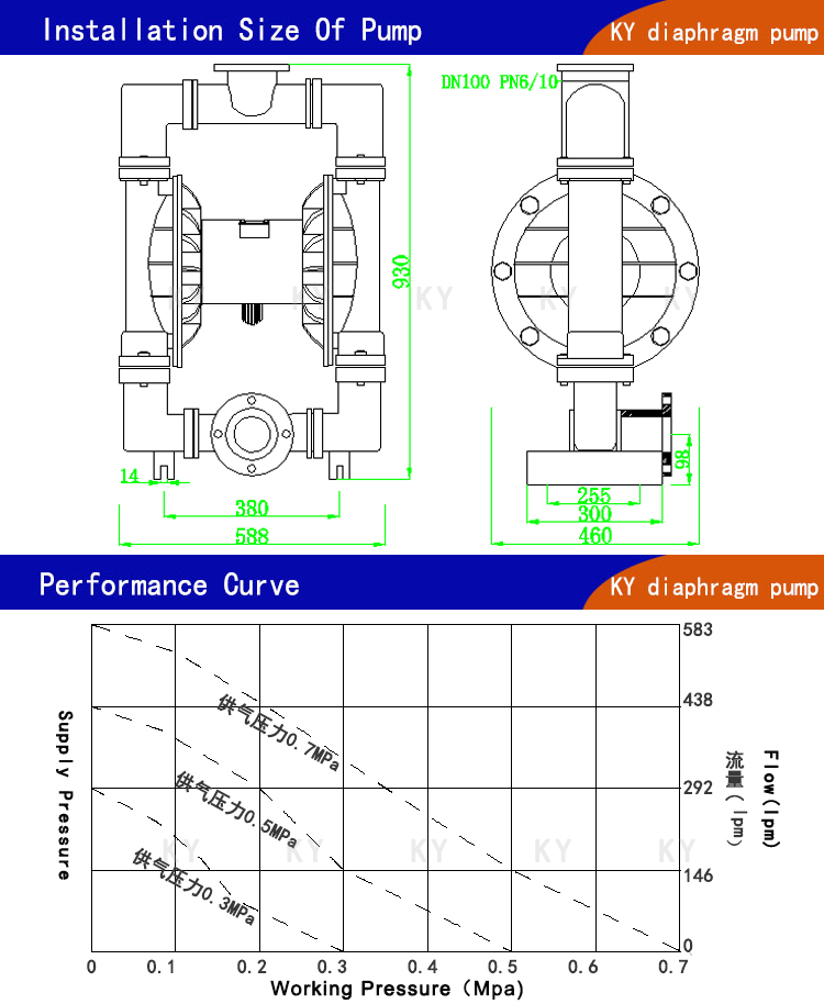 7、QBY-K100LC氣動(dòng)隔膜泵不需灌引水,吸程高達(dá)7米,揚(yáng)程達(dá)70米,出口壓力≧7bar