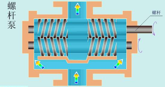 雙螺桿泵與齒輪泵十分相似,一個(gè)螺桿轉(zhuǎn)動(dòng),帶動(dòng)另一個(gè)螺桿,液體被攔截在嚙合室內(nèi),沿桿軸方向推進(jìn),然后被擠向中央排出。