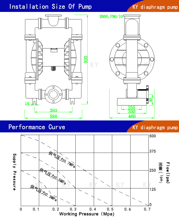 7、第四代氣動隔膜泵不需灌引水,吸程高達7米,揚程達70米,出口壓力≧7bar;通過性能好,允許通過最大顆粒直徑達10毫米。